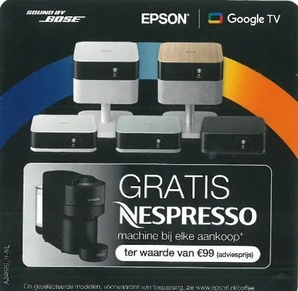 Bij aankoop van een deelnemend Epson-model ontvang je gratis een Nespresso-machine ter waarde van €99 (adviesprijs).