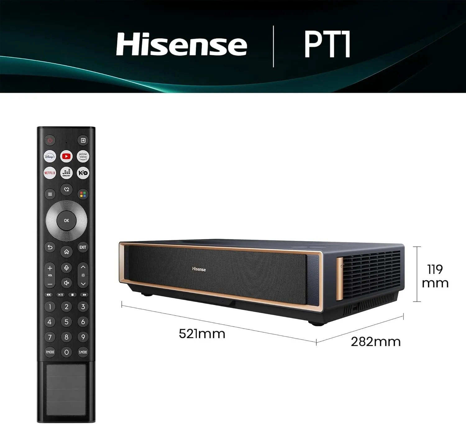 De Hisense PT1 is een geavanceerde ultra short throw laserprojector die een indrukwekkende thuisbioscoopervaring levert zonder dat je veel ruimte nodig hebt. Dankzij de Triple Laser-technologie, 4K UHD-resolutie en Google TV combineert deze projector hoogwaardige beeldkwaliteit met slimme functies en krachtige audio.