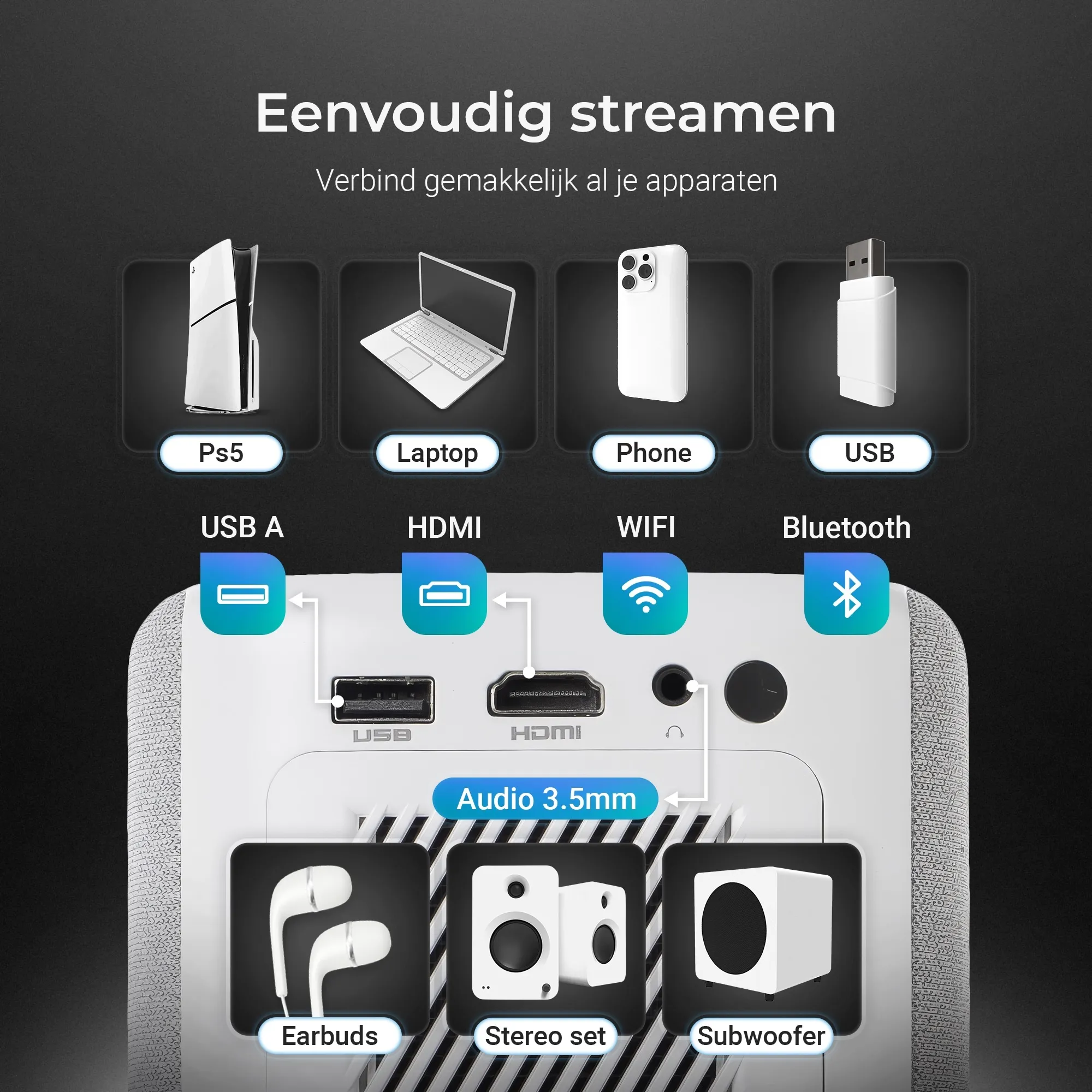 De Lumenix AIR is ontworpen voor flexibiliteit en draagbaarheid. Met een gewicht van slechts 1,1 kg en een geïntegreerd handvat neem je hem moeiteloos mee naar een andere kamer, naar vrienden of zelfs op vakantie. De ingebouwde 3W stereo speakers met Dolby Audio zorgen voor helder geluid zonder externe apparatuur.