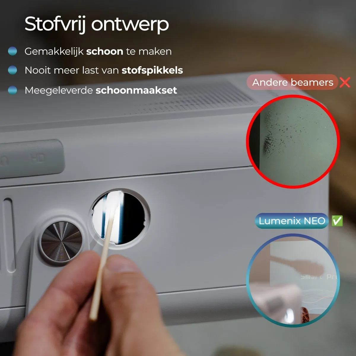 Een veelvoorkomend probleem bij mini-beamers is stof achter de lens, wat niet schoon te maken is en blijvende vlekken veroorzaakt. De Lumenix NEO lost dit op met een slimme zij-opening waarmee je eenvoudig stof verwijdert met het meegeleverde reinigingsstaafje. Hierdoor blijft het beeld haarscherp en gaat de beamer aanzienlijk langer mee.