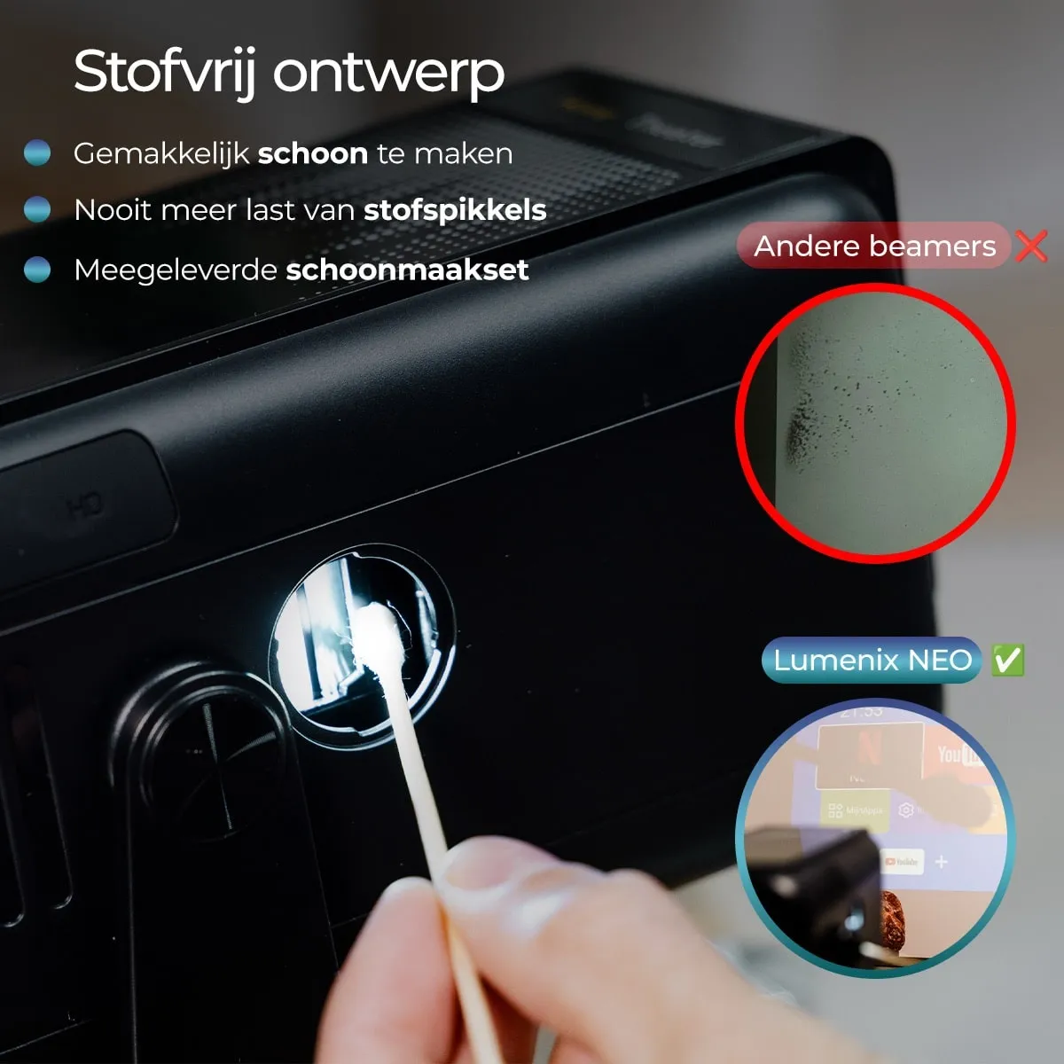 Een veelvoorkomend probleem bij mini-beamers is stof achter de lens, wat niet schoon te maken is en blijvende vlekken veroorzaakt. De Lumenix NEO lost dit op met een slimme zij-opening waarmee je eenvoudig stof verwijdert met het meegeleverde reinigingsstaafje. Hierdoor blijft het beeld haarscherp en gaat de beamer aanzienlijk langer mee.
