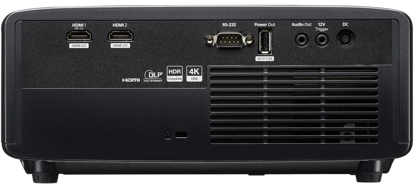 De projector is voorzien van meerdere aansluitmogelijkheden, waaronder 2 HDMI 2.0-poorten, USB-voeding, audio-uitgang en een 12V trigger voor schermbediening. Ook is er ondersteuning voor RS-232, wat integratie in professionele installaties mogelijk maakt.