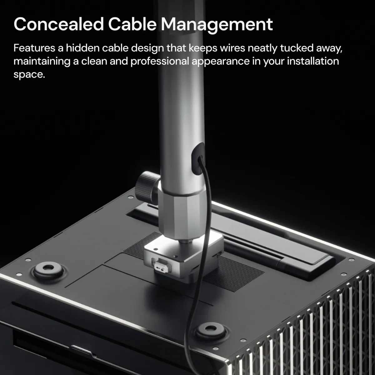 Een belangrijk voordeel van deze montagekit is het geïntegreerde kabelmanagement. Kabels lopen door de verticale buis, waardoor de installatie netjes en professioneel oogt. Dit voorkomt losse bekabeling rondom de projector en draagt bij aan een minimalistische uitstraling.