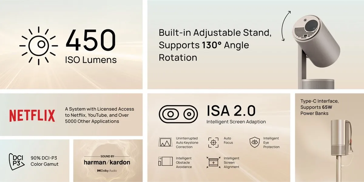 Met een gewicht van slechts 1,1 kg en een compact ontwerp neem je de MoGo 3 Pro eenvoudig mee naar verschillende kamers, vrienden of op vakantie. Ondanks zijn formaat ondersteunt de beamer een projectiegrootte van ca. 40 tot 200 inch, afhankelijk van de plaatsing.