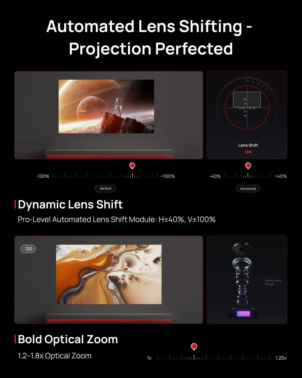 Een ingebouwd automatisch lensverschuivingsmodule maakt installatie eenvoudig: automatische focus, automatische trapeziumcorrectie en lensverschuiving helpen je om het perfecte beeld te krijgen zonder handmatige aanpassingen.